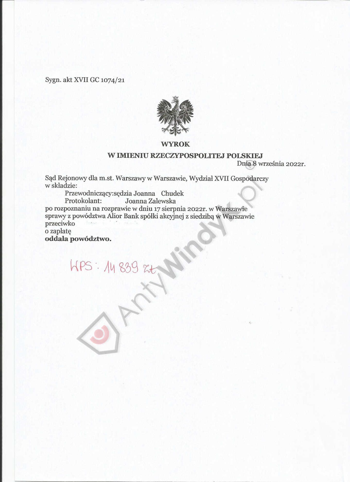 ALIOR BANK – wyrok z dnia 08.09.2022